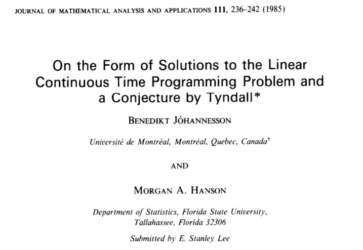 Birtist í Morgunblaðinu 19.12. 1981 undir heitinu Doktorsritgerð um fræðilega lausn línudæma. Blaðamaðurinn hafði samband við mig meðan við vorum heima í jólafríi og skrifaði frétt upp úr því samtali. Ég fékk uppkast að fréttinni og skrifaði hana alla upp aftur. Las hana svo ekki fyrr en löngu seinna og sá að fyrirsögnin var brengluð. Framhaldsnámið í Mogganum var líka bara sagt vera árið 1979, en þá kláraði ég masterspróf. Annars var þetta bara nokkuð rétt.