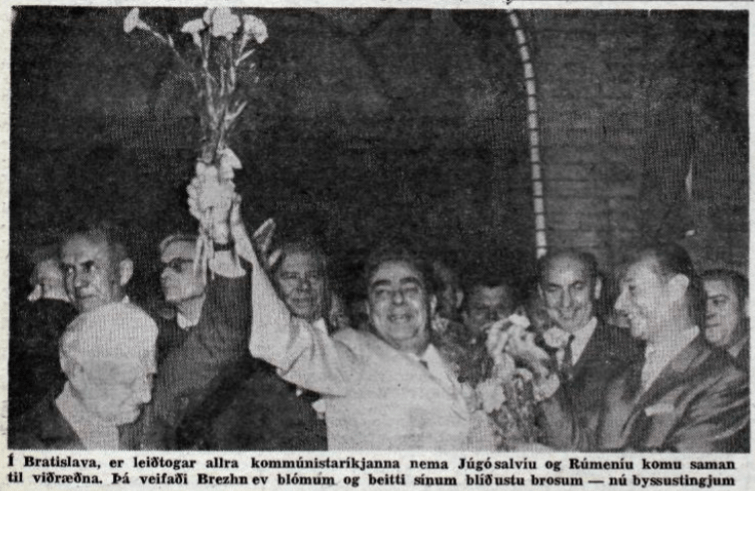 Sá atburður sem hafði mest áhrif á mig þetta sumar var innrás Sovétmanna í Tékkóslóvakíu þann 21. ágúst. Vorið í Prag hafði vakið gleði allra, frjálslyndir foringjar höfðu náð yfirhöndinni í kommúnistaflokki landsins og leiddu í lög ýmsar umbætur, meðal annars mál- og ritfrelsi. Íslenskir sósíalistar töldu að nú væri loks kominn fram kommúnismi með mannlegu yfirbragði, en unnendur frelsis fögnuðu auðvitað umbótum. Morgunblaðið fór seint í prentun og náði að segja frá innrásinni um nóttina strax um morguninn, en Þjóðviljinn varð seinheppinn og sagði í margtilvitnaðri grein þennan sama dag: „Mikið mega Tékkóslóvakar fagna því að hafa engan „Sjálfstæðisflokk“ í landi sínu. Og ekkert Morgunblað.“ Á forsíðu Moggans var myndin sem fylgir greininni.