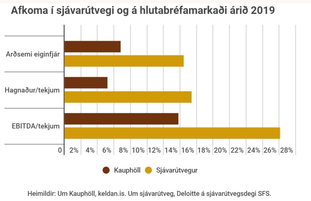 Seinni fullyrðing SFS um að arðsemi eiginfjár sé minni í sjávarútvegi hjá félögum í Kauphöllinni er sérstæð. Tökum samanlagðan hagnað félaga í Kauphöllinni að Brimi, eina skráða sjávarútvegsfyrirtækinu, slepptu. Niðurstaðan er á þessari mynd: