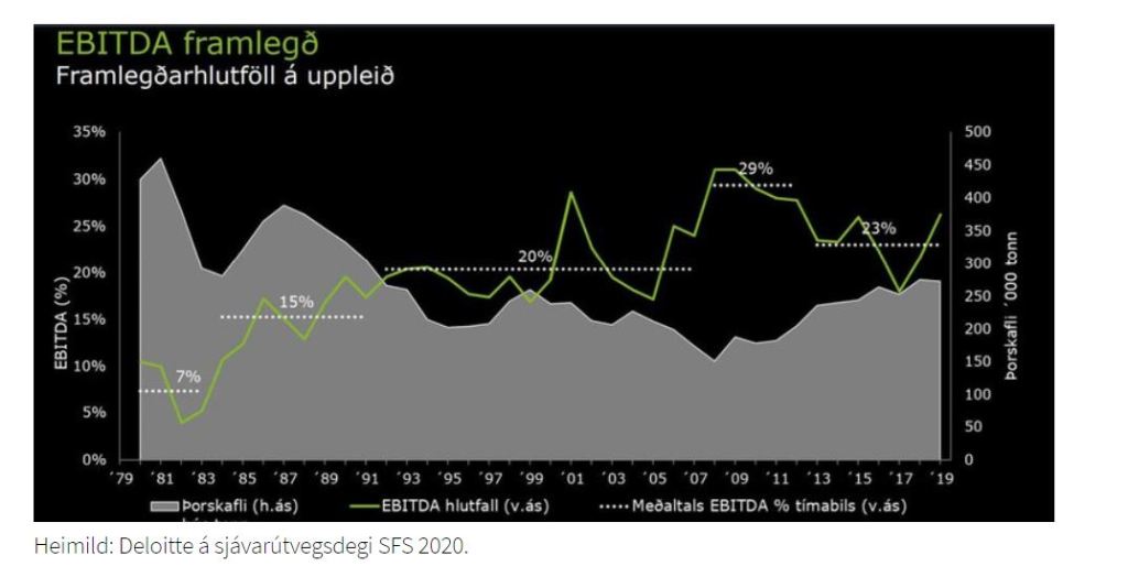 Líklega eru fáar atvinnugreinar sem búa við það öryggi sem útgerðin hefur notið eftir að kvótakerfinu var komið á. Einmitt á sjávarútvegsdeginum er brugðið ljósi á þetta með snjallri mynd Jónasar Gests Jónassonar löggilts endurskoðanda hjá Deloitte, sem sýnir hvernig svonefnd EBIDTA-framlegð hefur þróast allt frá 1979 til 2019. Eins og glæran sýnir er hún á uppleið. Ég man þá tíð þegar útgerðir kepptu að því að ná 20% EBIDTA-framlegð. Undanfarin ár hefur hún oftast verið miklu hærri og var 26% í fyrra. Kosturinn við að horfa á slíka stærð yfir langt tímabil er að hún er óháðari fjármögnun og fjárfestingum en hagnaður ársins og hentar því til samanburðar.
