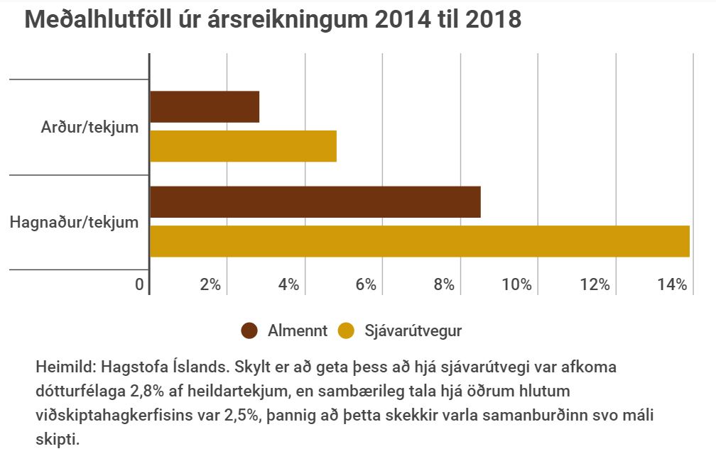 Svar: Ræðum arðgreiðslur. Vissulega er erfitt að bera saman hlutföll milli atvinnugreina, en tökum tölur Hagstofunnar um arð og hagnað, annars vegar í sjávarútvegi og hins vegar í viðskiptahagkerfinu að undanskilinni lyfjaframleiðslu, sorphirðu, fjármála- og vátryggingastarfsemi og sjávarútvegi. Við getum borið saman tölur úr ársreikningum árin 2014-18 (sem eru nýjustu tölur úr ársreikningum á vef Hagstofunnar).