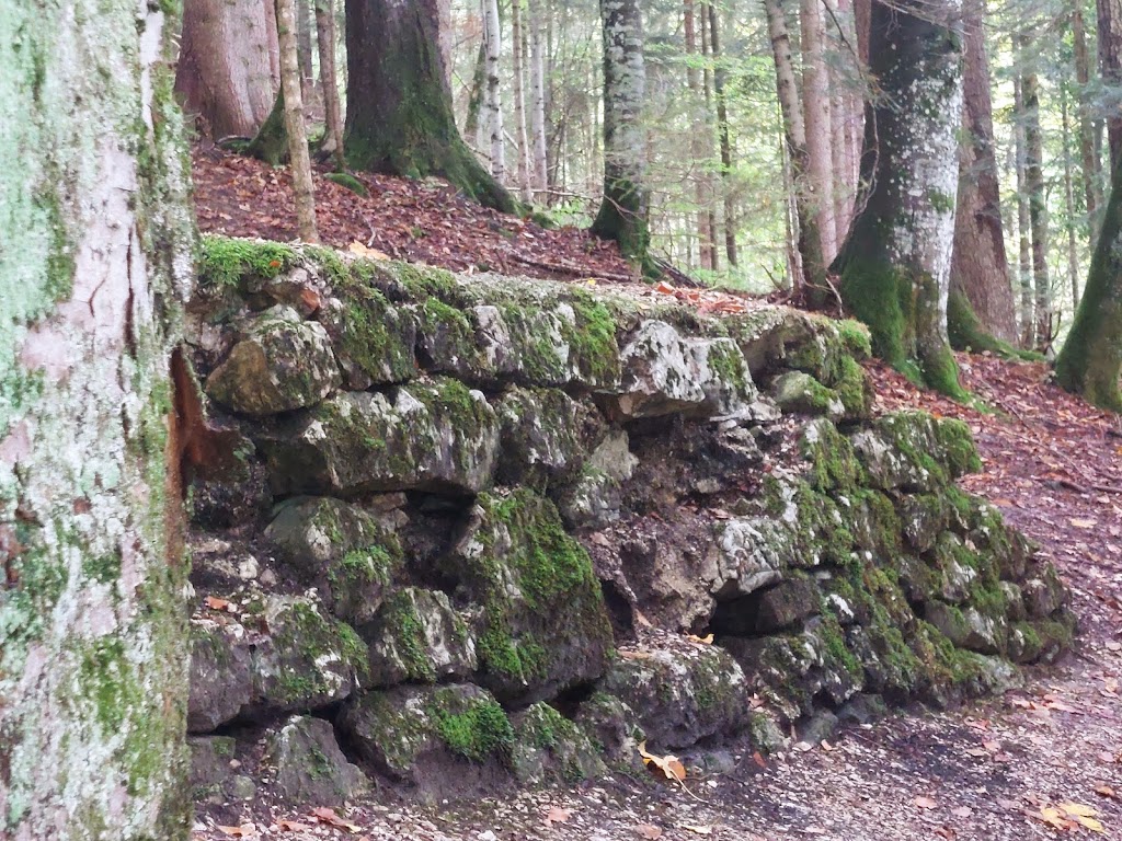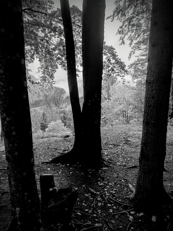 Við örkuðum svo af stað, líklega um tólfleytið. Fallegir haustlitir á leiðinni, en þoka og rigning drógu úr útsýninu, sem þá var nokkuð. Claudio stoppaði á nokkrum stöðum þar sem við gátum fengið okkur smábita og sopa. Einn hópur ungra manna gekk hratt framhjá okkur, meðal annars einn sem var í stuttum bol og knöppum buxum þannig að við blasti fallegt tattú á bakinu og niður eftir rasskinninni. Mér hefði verið alveg sama þótt ég hefði farið á mis við þessa upplifun. Svo voru líka einn eða tveir hjólreiðamenn á uppleið, en fleiri fóru niður, það er líklega léttara. Claudio sagði að á sumrin væru stígarnir fullir af fólki. Hægt er að ganga fram í október, en núna í september snjóaði og fjallið var lokað í nokkra daga. Rúturnar sem allar voru á sumardekkum komust þá ekki þrönga vegina.