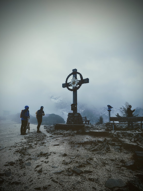 Rétt í lokin á göngunni fór að rigna og skjólið var kærkomið. Þarna uppi voru nokkrir svartir fuglar, en engir ernir. Líklega krákur, þó að ég hefði kallað þá hrafna, er ekki vel klár á muninum. Á veitingahúsinu fengum við okkur heita drykki, ég glögg og Vigdís heitt súkkulaði. Í veitingasalnum er fallegur arinn úr marmara sem talið er að Mussolini hafi gefið vini sínum. Fyrir utan veitingahúsið eru nokkur spjöld sem rekja söguna. Útsýnið þar er örugglega fallegt í sólskini en þegar þarna var komi sögu var komin hellirigning og ég hljóp upp að krossi þar fyrir ofan með óvenjulegu lagi. Þó ekki hakakross heldur keltneskur kross sem þeir voru líka hrifnir af drengirnir, en ég veit ekki hvenær hann var settur upp. Flýtti mér svo niður en steig í poll þegar amerískt par tróðst fram fyrir mig. Það er ekki gott að vera blautur í fæturna, en sem betur fer var mestur hluti göngunnar búinn. Fórum svo aftur niður í lyftunni, sem er mjög skrautleg, með gylltum römmum, gamalli klukku og síma.