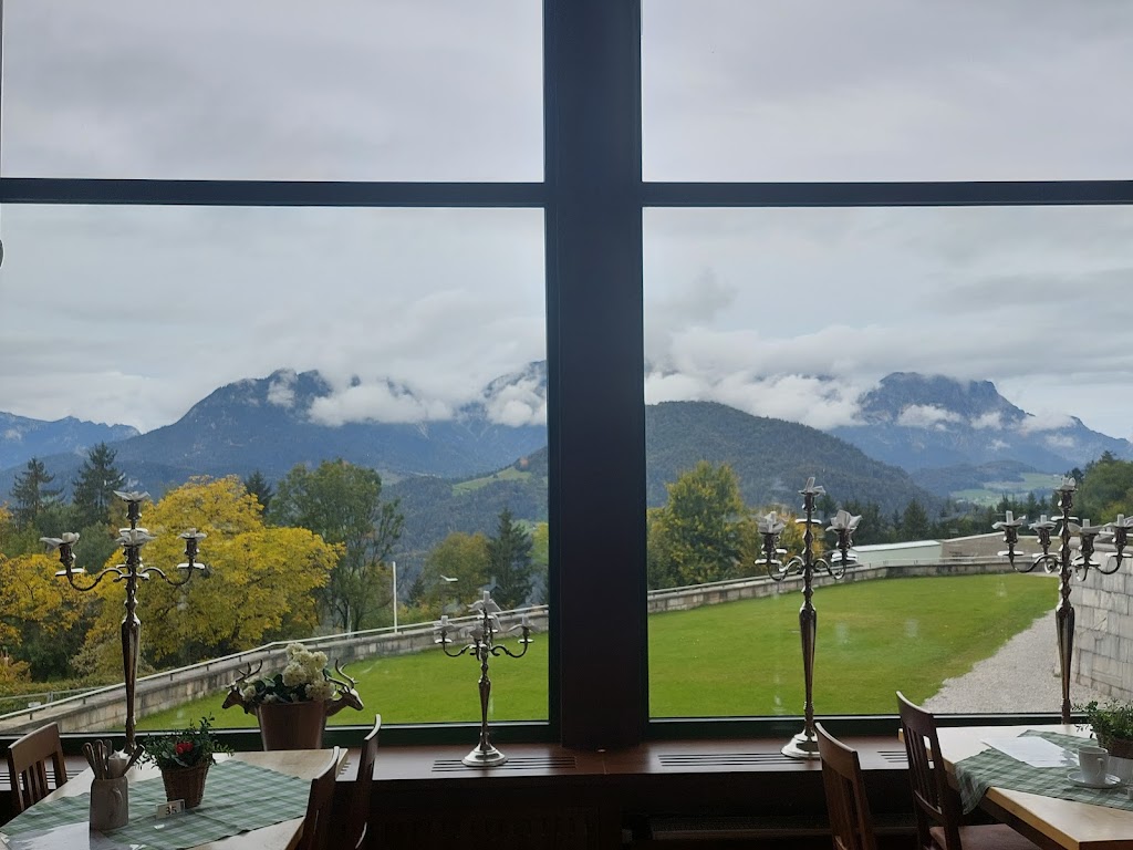 Við fórum fyrst á hótelið Berggasthof, þar sem mjög glæsilegt útsýni blasir við út um stóran gluggann. Sagt er að Adolf hafi fyrst farið þangað árið 1923 og unað sér svo vel að hann reisti sér hús þar þegar hann var orðinn einræðisherra. Inni í skóginum gengum við að lítilli steypuplötu þar sem Claudio sagði að Hitler og Hess hefðu setið við að skrifa Mein Kampf. Þar er ekkert annað sem sýnir að þarna hafi verið kofi. Hvergi var neitt minnst á AH nema í Ipaddinum hans Claudios sem sýndi okkur margar myndir meðan hann sagði sögur. Á einni var foringinn tilvonandi í lederhosen, en sú mynd var ekki sýnd opinberlega fyrr en eftir stríð. „It shows he had great legs“, sagði Claudio.