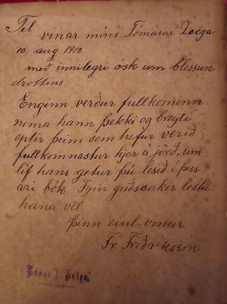 Tómas, afi minn, fékk reyndar Hið nýa [svo] testamenti drottins vors Jesú Krists ásamt með Davíðs sálmum áritað frá sínum einl. vini Fr. Friðrikssyni, 10. ágúst árið 1900, líklega þegar Tómas var á leið austur á land að freista gæfunnar. Líklega hefur afi verið einn af stofnfélögum KFUM, án þess að ég viti það fyrir víst. Þessa bók fékk ég að gjöf frá Reyni föðurbróður mínum árið 2001 og þótti vænt um.
