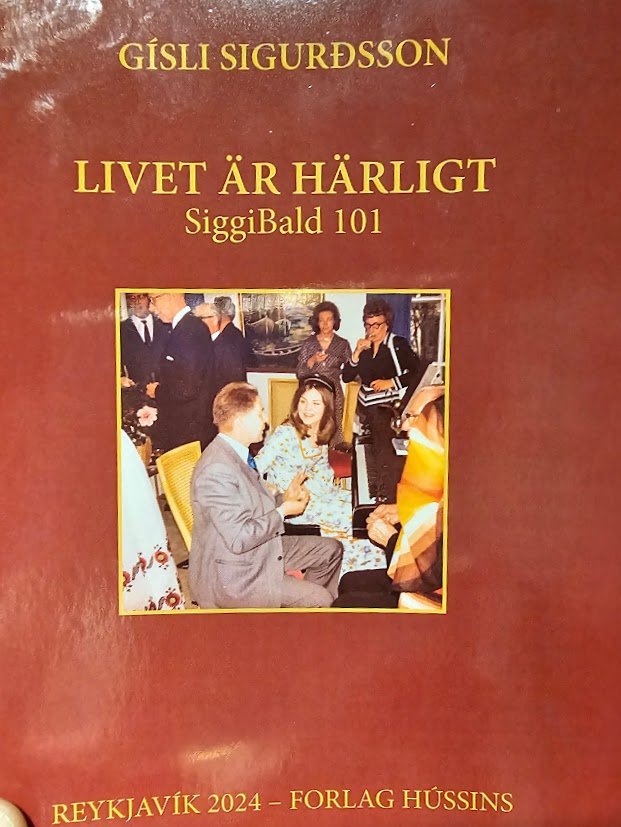 Mér þykir alltaf vænt um góðar kveðjur og skoðaði gripinn betur. Á forsíðu stóð nafn höfundarins: Gísli Sigurðsson. Svo Livet är härligt. Undirtitill SiggiBald 101. Myndin sem ég áttaði mig ekkert á reyndist vera vangamynd af Sigga Baldurs í einhverju samkvæmi að sýna ungri konu handalistir sem hann lék oft. Ég kem öðru fólki á myndinni ekki fyrir mig. Neðst stendur svo: Reykjavík 2024 – Forlag hússins.
